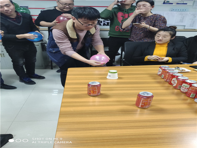 要求每隊(duì)出4人,接力吹氣球,再松開氣球口,用氣球跑氣時(shí)的氣流吹動(dòng)紙杯,