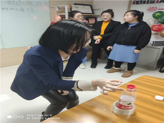 每隊(duì)選4人,按順序站好,原地捏鼻子轉(zhuǎn)3圈后,捂住一只眼睛向前走直線彈瓶蓋,